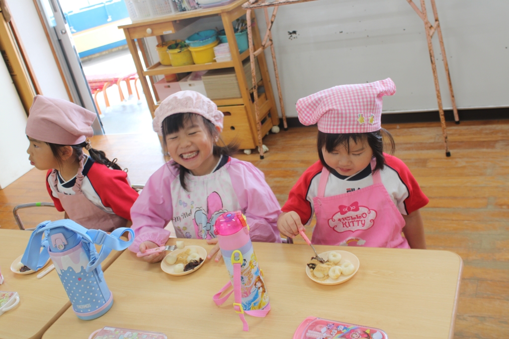 茹で上がったグループから、あんこときなこをつけて「いただきます!」