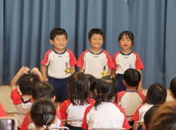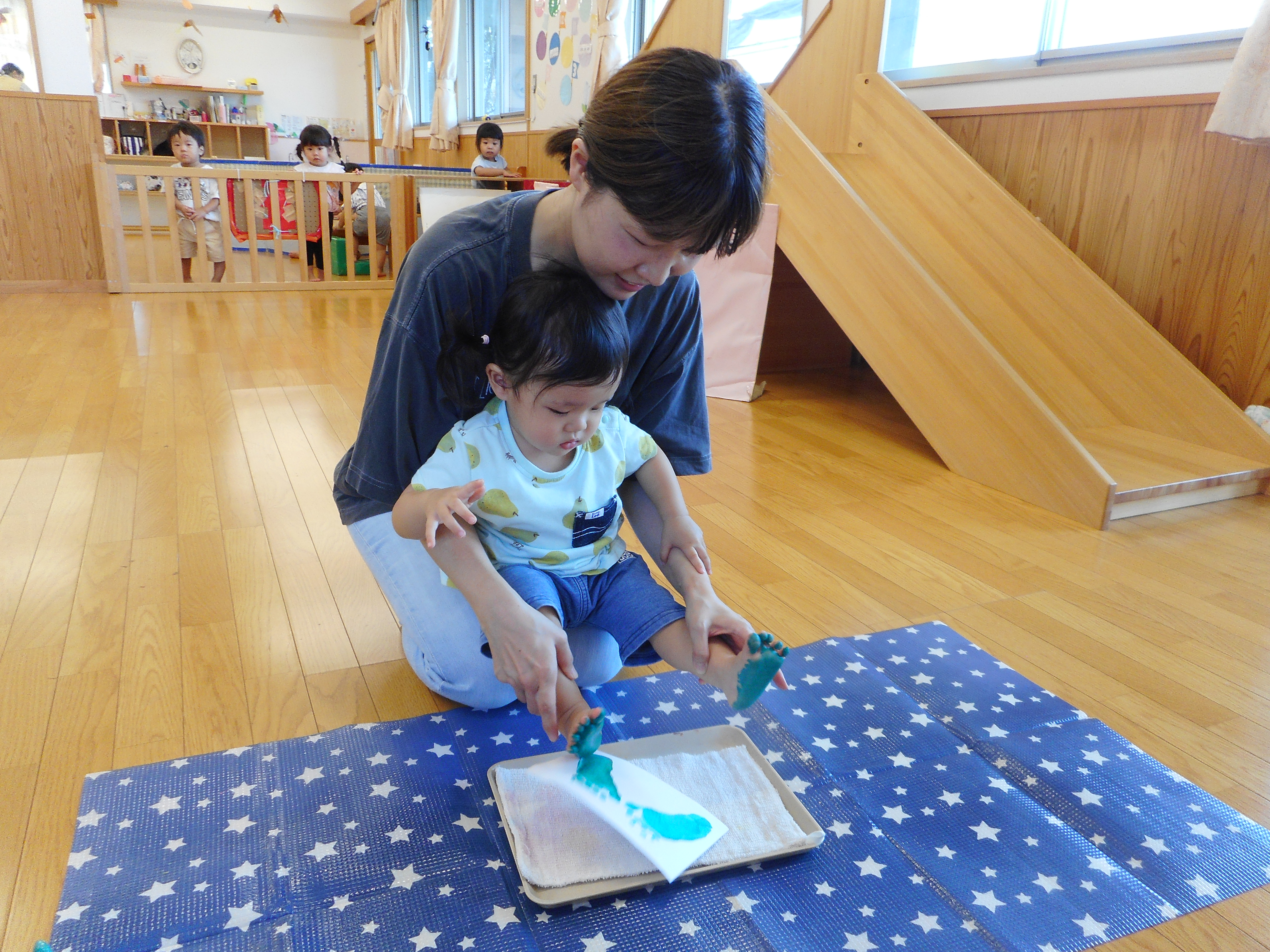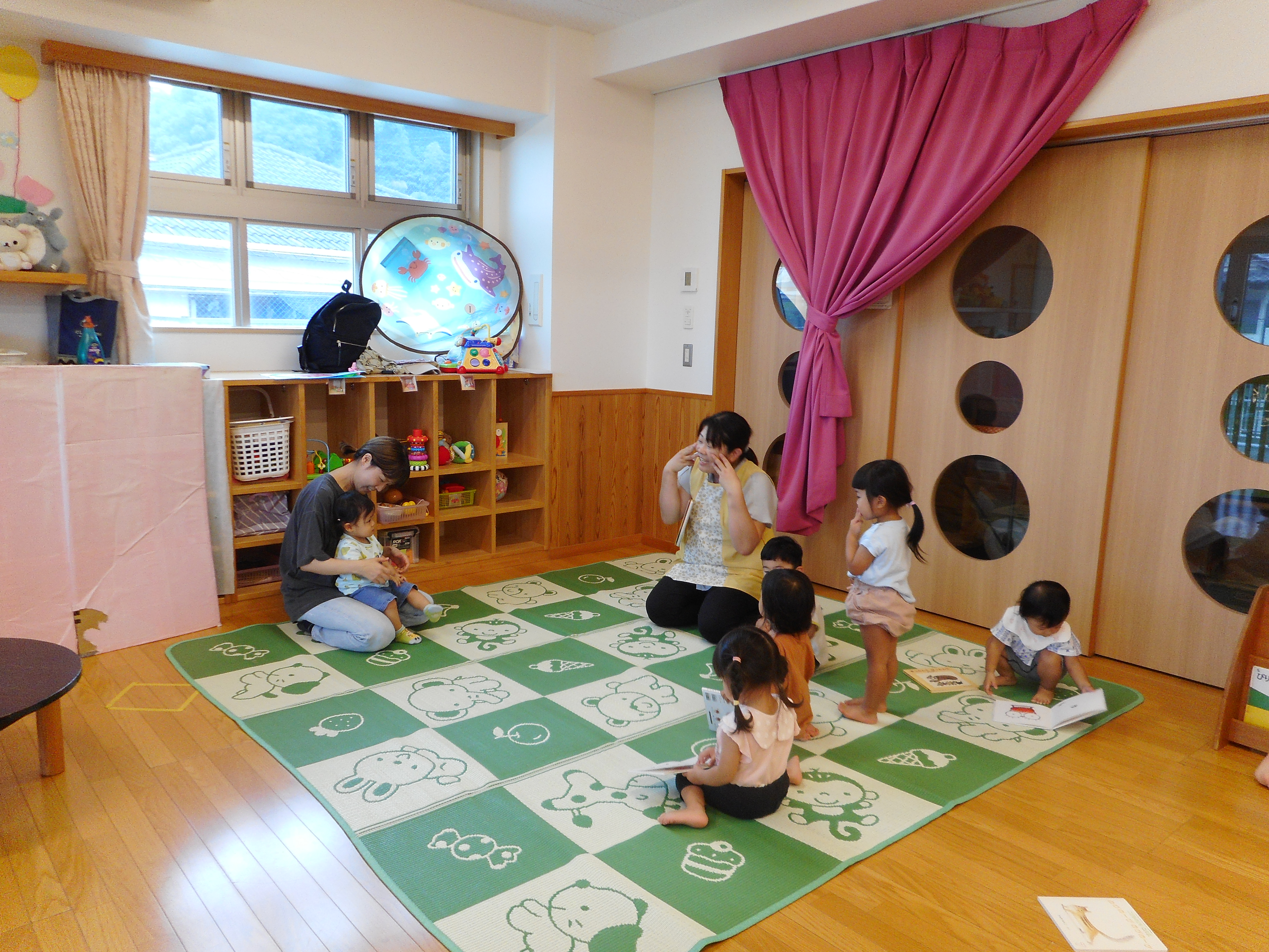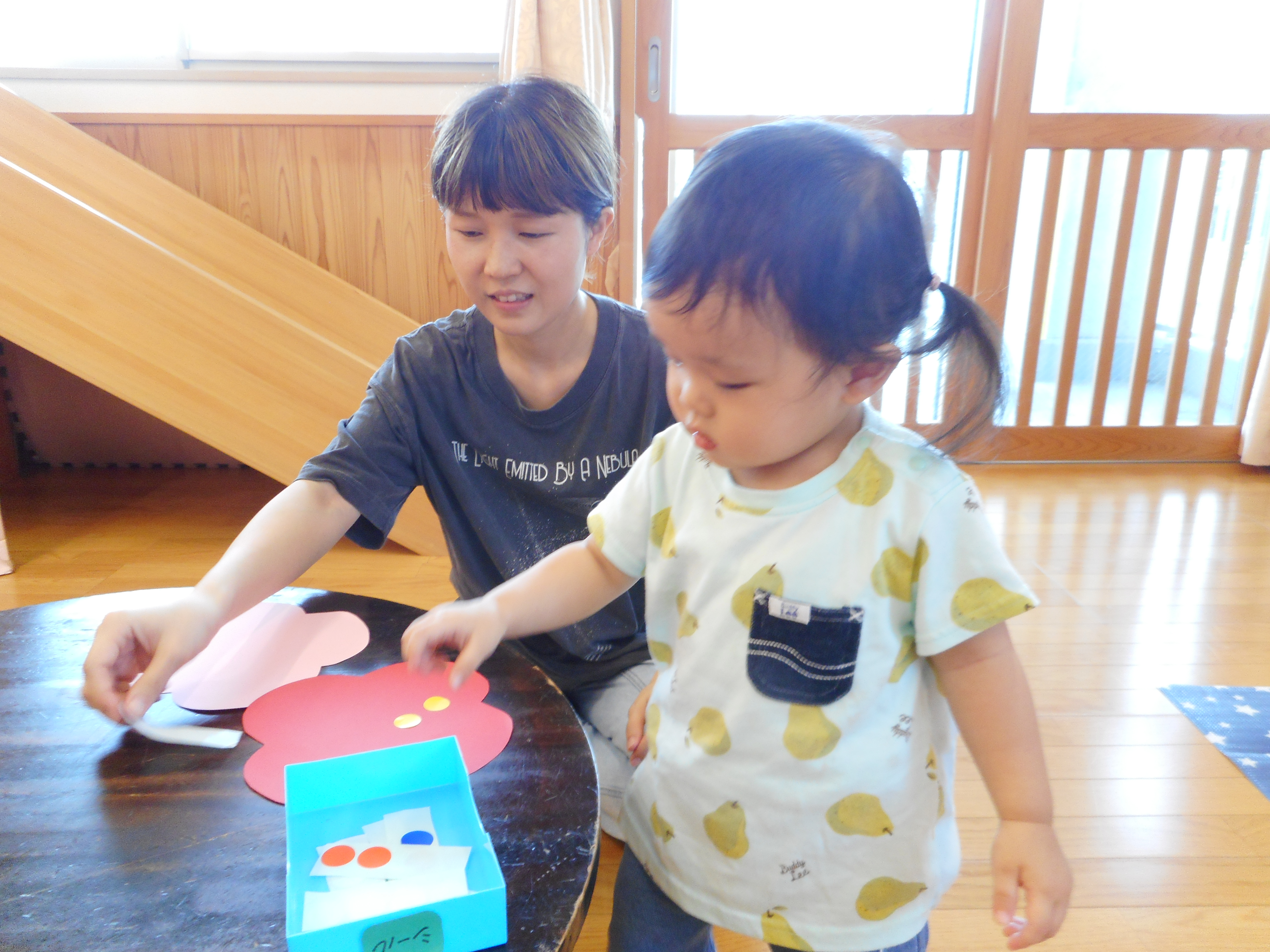 1歳児(バナナ組)のお友だちと一緒に手遊びを楽しんでいました。😊