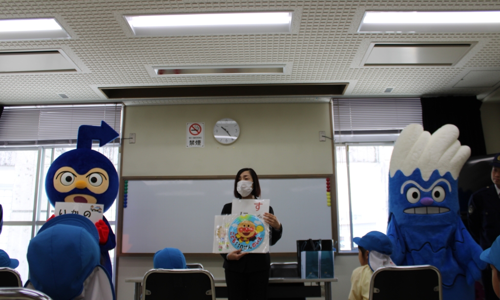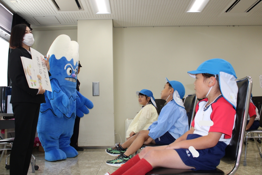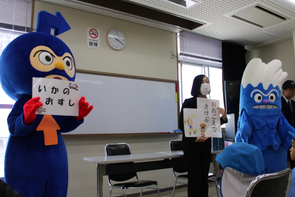 到着すると、沢山の警察官の方、防災キャラクターのつなみまん・ゆうどうくんが