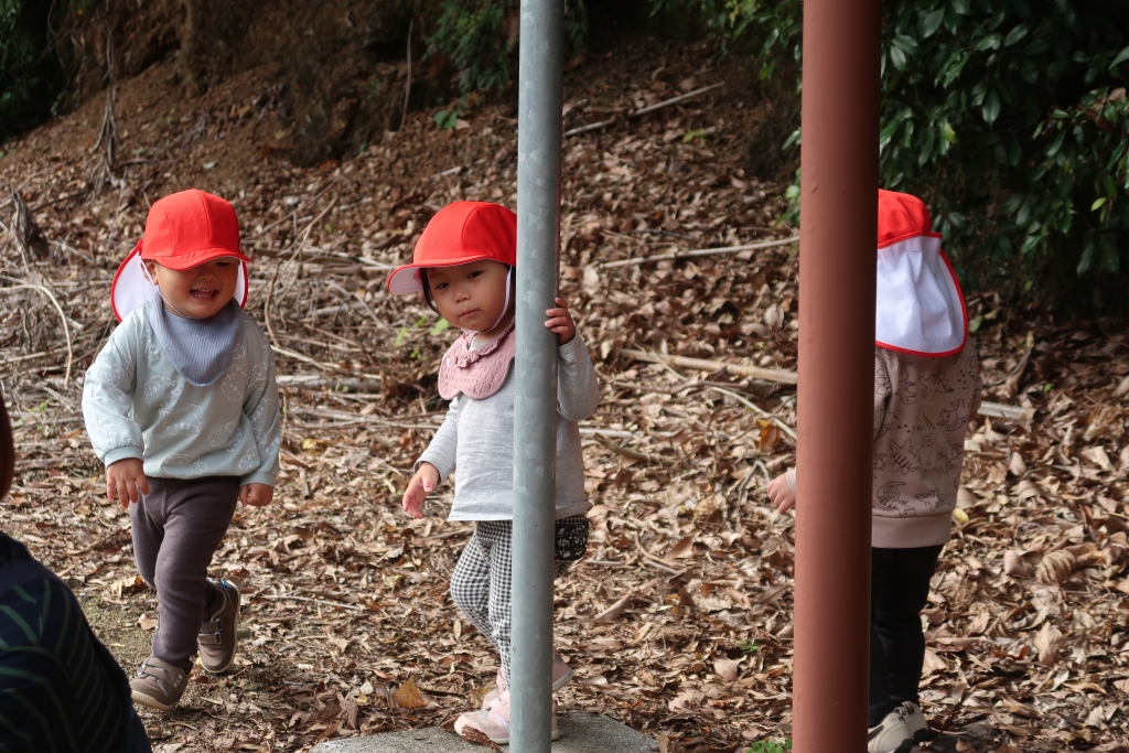 先日、向かい側の山にバナナ組と秋の自然物を見つけに散歩に行きました