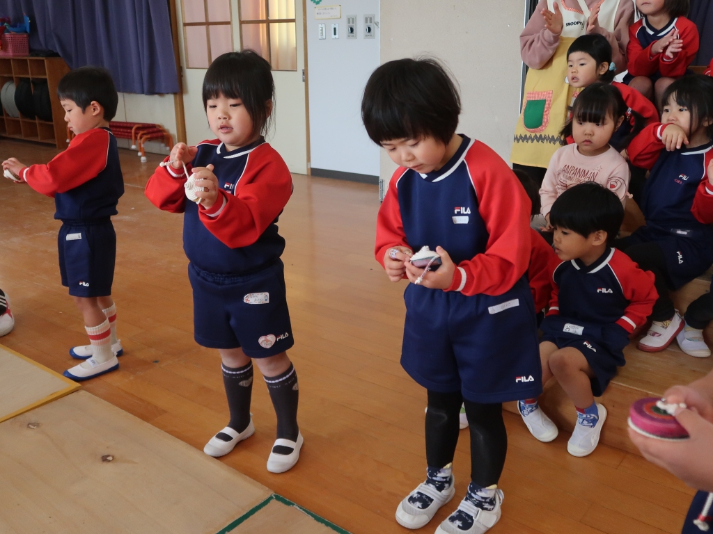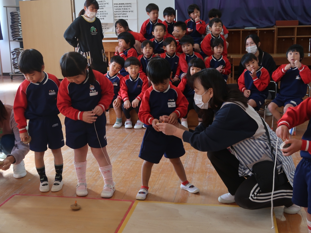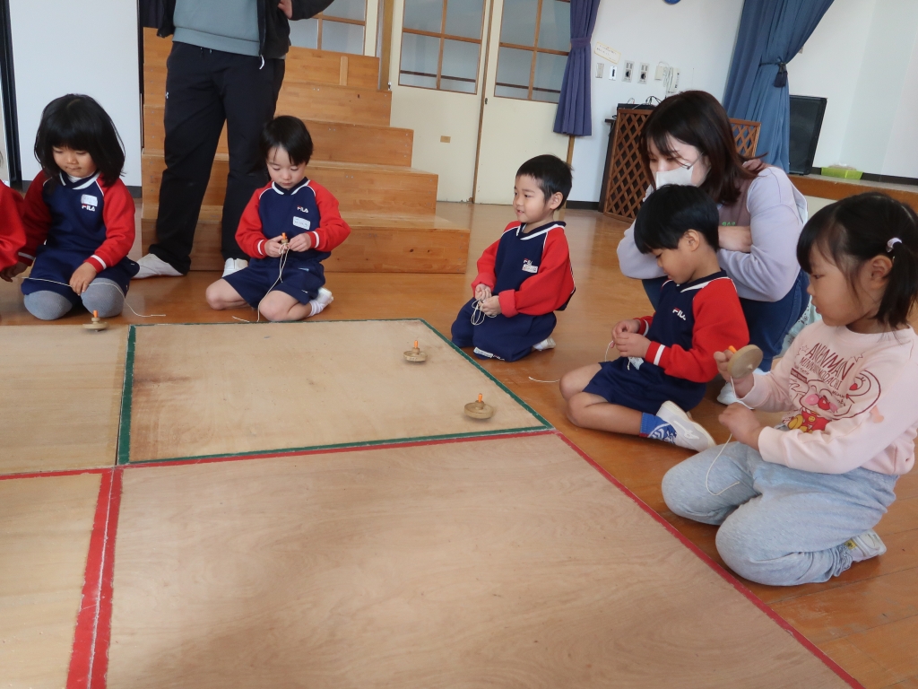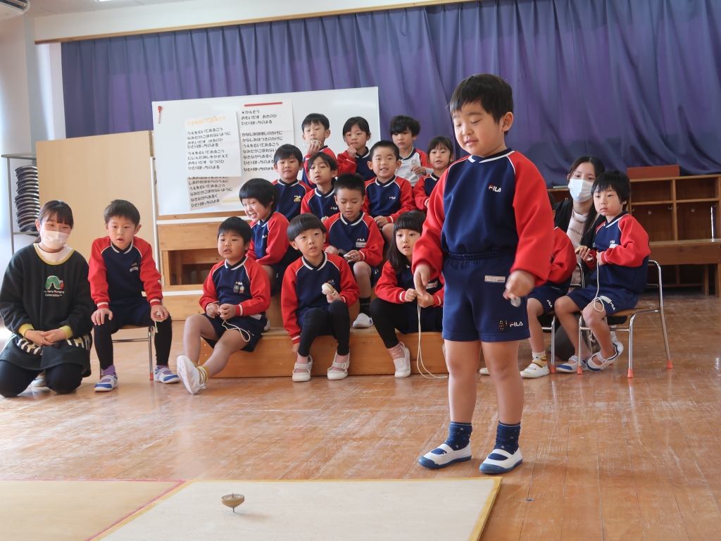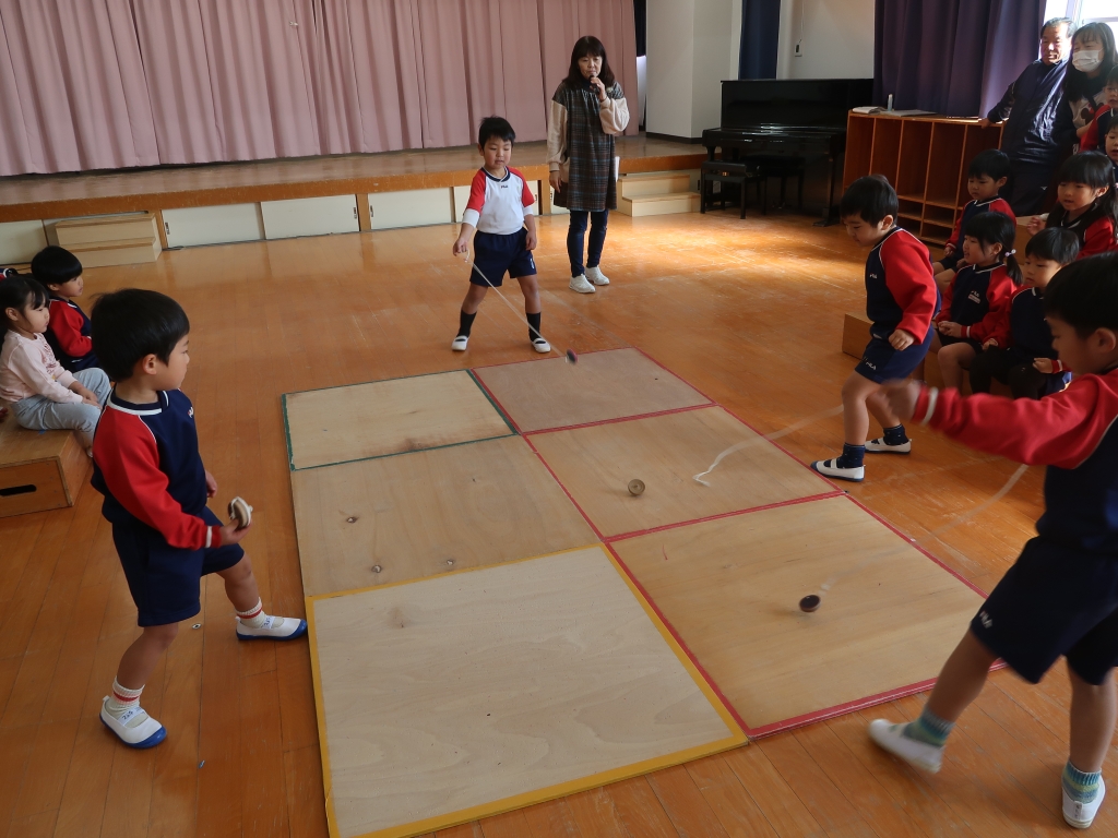 みさと幼稚園では1月の遊びの経験をへて、こま回し大会・かるた取り大会が開催され、