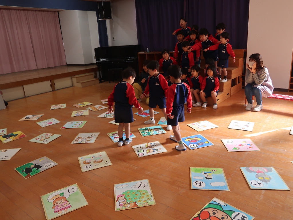 わくわくグループに分かれて、みさと幼稚園お手製大型かるた取り大会🙌