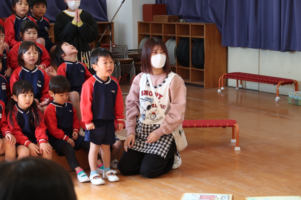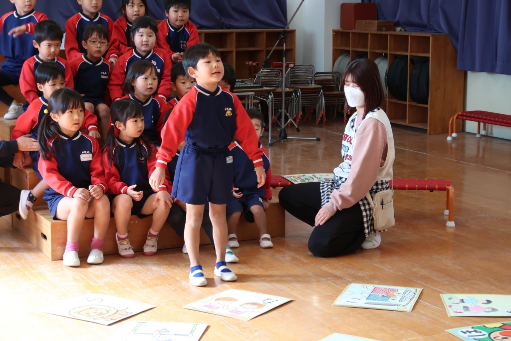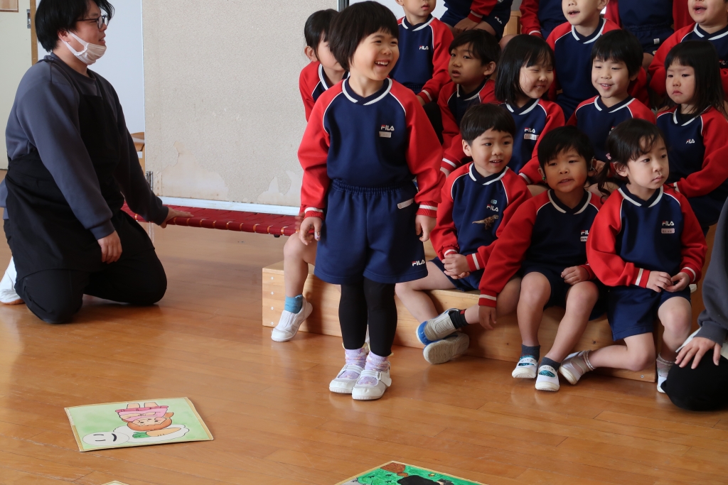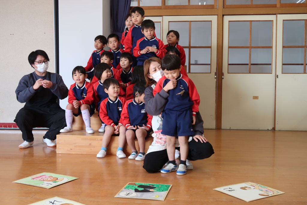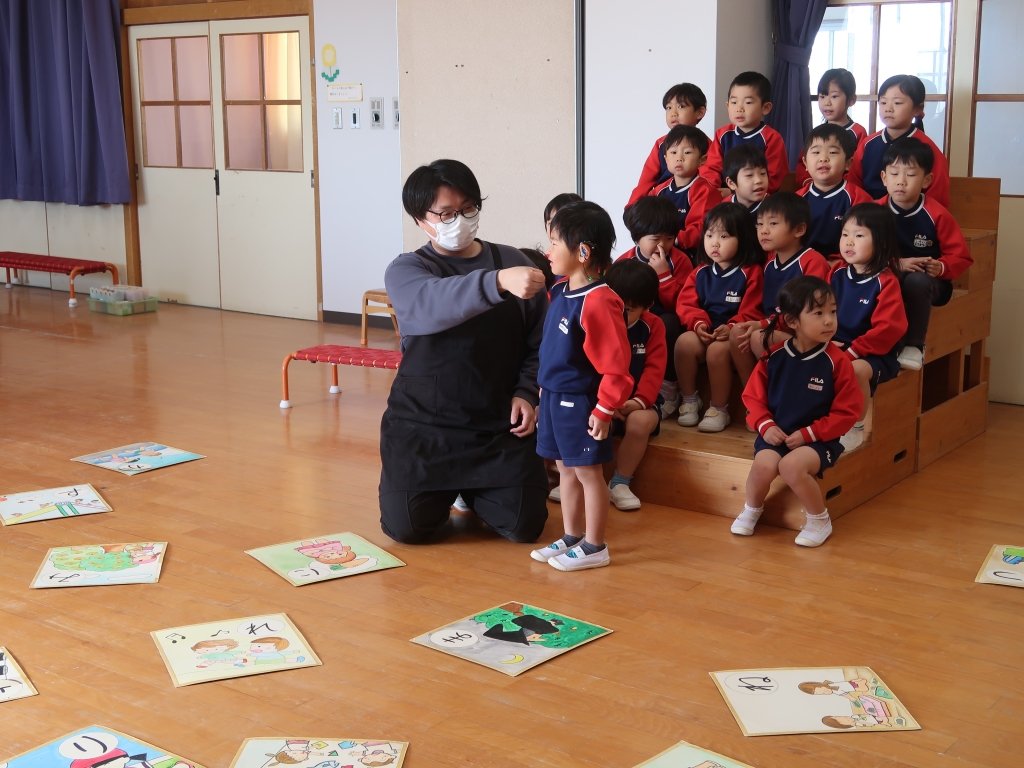 年少児は保育者と一緒にかるた取りに挑戦😊
