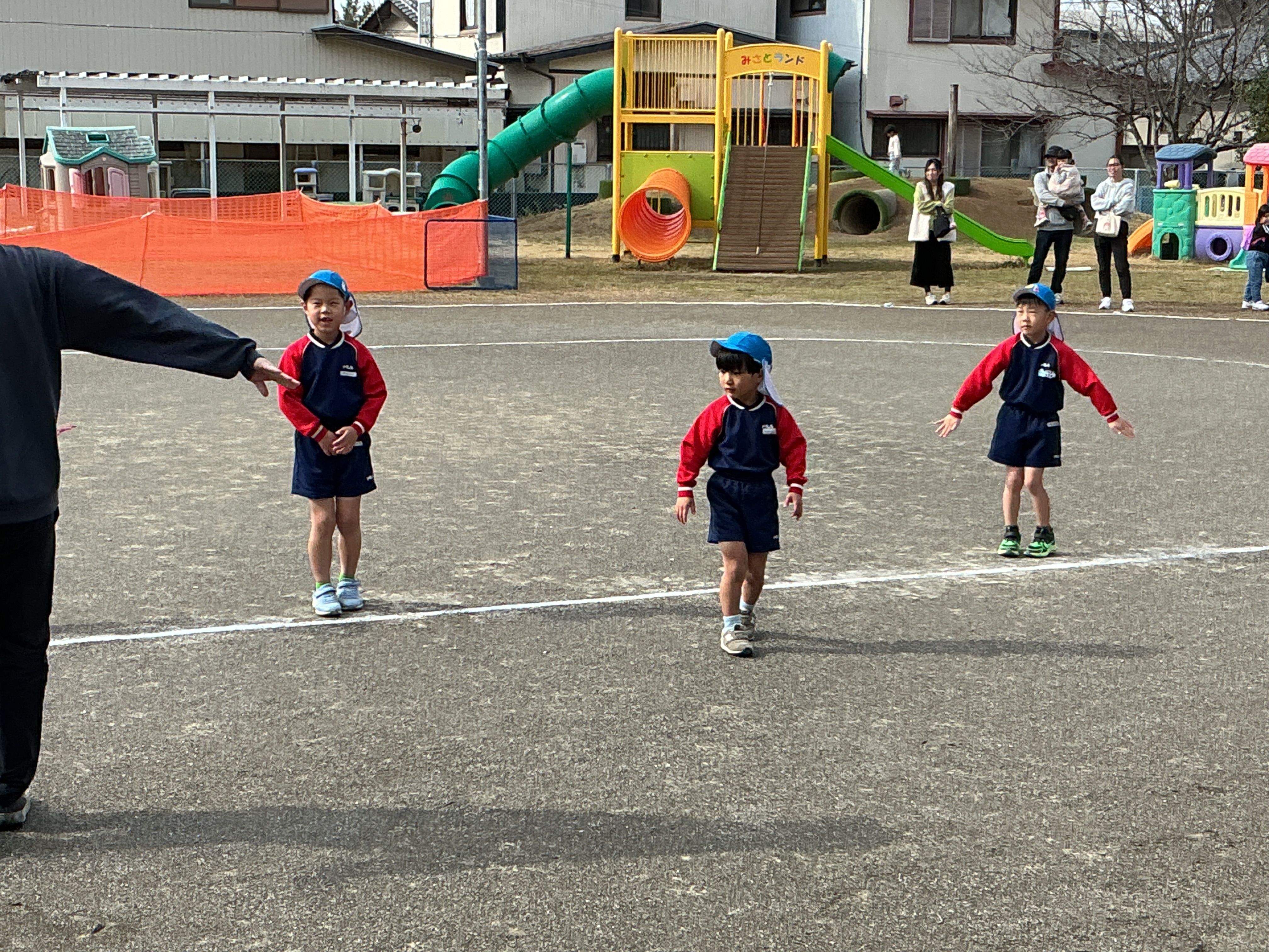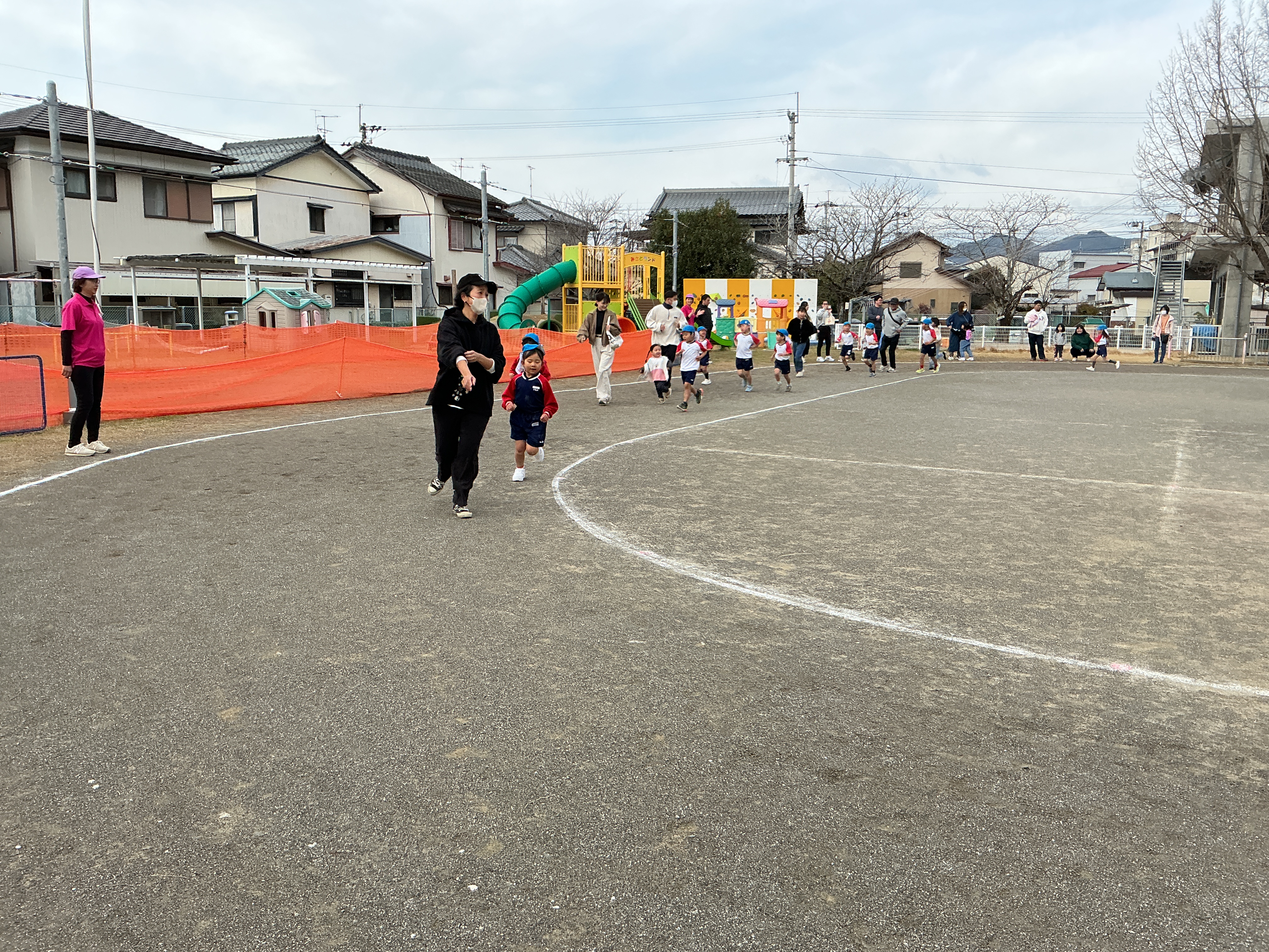 繰り返し行ってきたマラソンでは、幼稚園最後の親子で走る時間となりました。『おこさんと一緒に走りませんか~』👩のアナウンスに